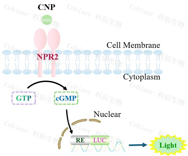 NPR2 Effector Reporter Cell 報告基因藥靶模型很好的模擬了體內(nèi) NPR2 的信號轉(zhuǎn)導(dǎo)過程,原理見下圖所示。