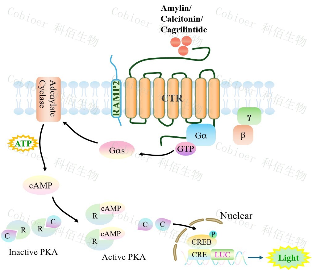 CTR&RAMP2 CRE-Luc CHO 報告基因藥靶模型很好的模擬了體內(nèi) CTR&RAMP2 的信號轉(zhuǎn)導(dǎo)過程,原理見下圖所示。