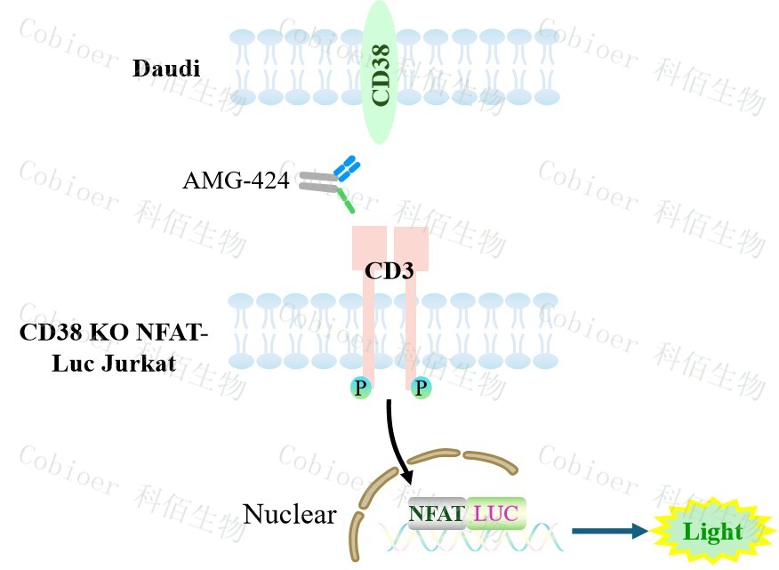 CD38 KO NFAT-Luc Jurkat Cell 報告基因藥靶模型通過報告基因的信號反映 T 細胞受體 (TCR)信號通路的激活水平,原理見下圖所示。![]() Figure 1. CD38 KO NFAT-Luc Jurkat Cell 細胞模型圖 |