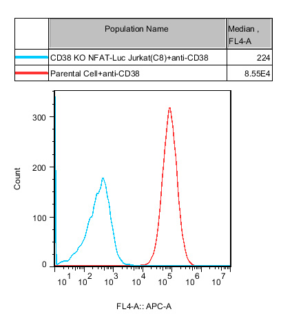 ![]() Figure 2.CD38 KO NFAT-Luc Jurkat Cell,在 NFAT-Luc Jurkat Cell 的基礎上,敲除人的 CD38。 |