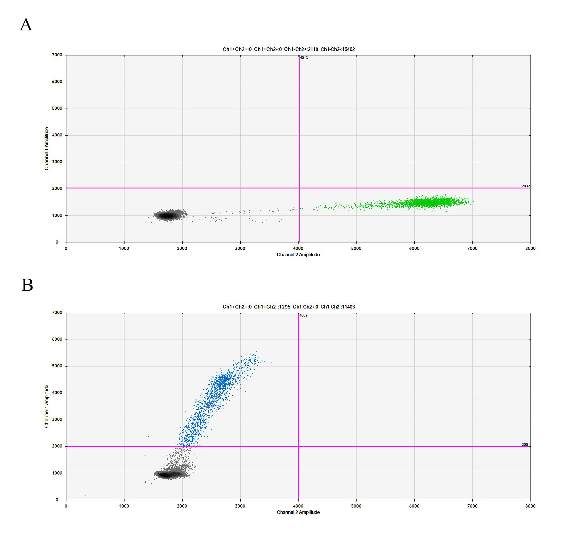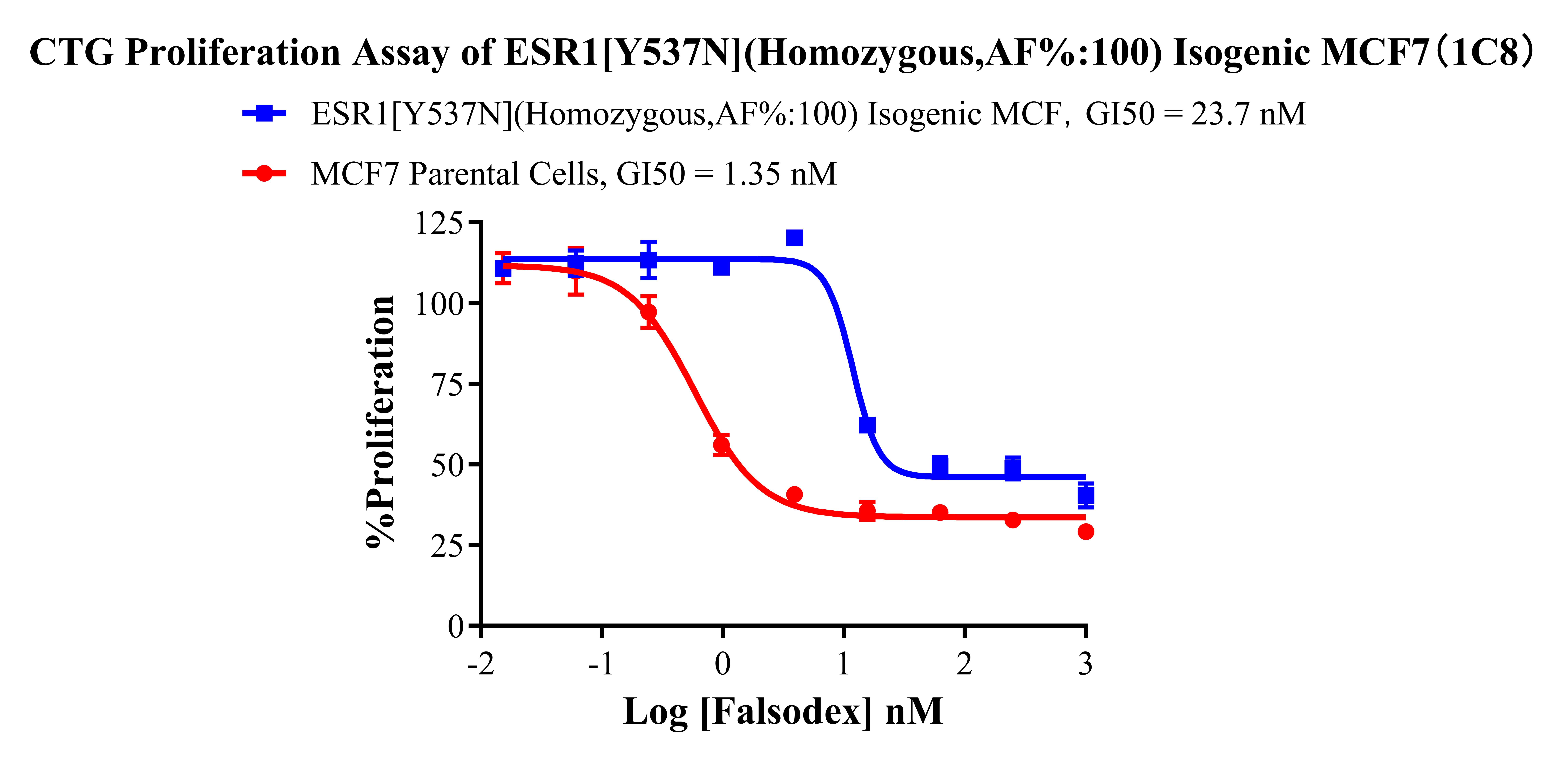 ![]() Figure 2. Sanger of ESR1[Y537N](Homozygous,AF%:100) Isogenic MCF7. ![]() Figure 3. A:MCF7 Parental Cell;B:ESR1[Y537N](Homozygous,AF%:100) Isogenic MCF7 通道2 藍(lán)色微滴代表ESR1[Y537N]突變陽性,通道2 綠色微滴代表該位點(diǎn)為陰性野生型 ![]() Figure 4. CTG Proliferation Assay of ESR1[Y537N(Homozygous,AF%:100) Isogenie MCF7(1C8). |