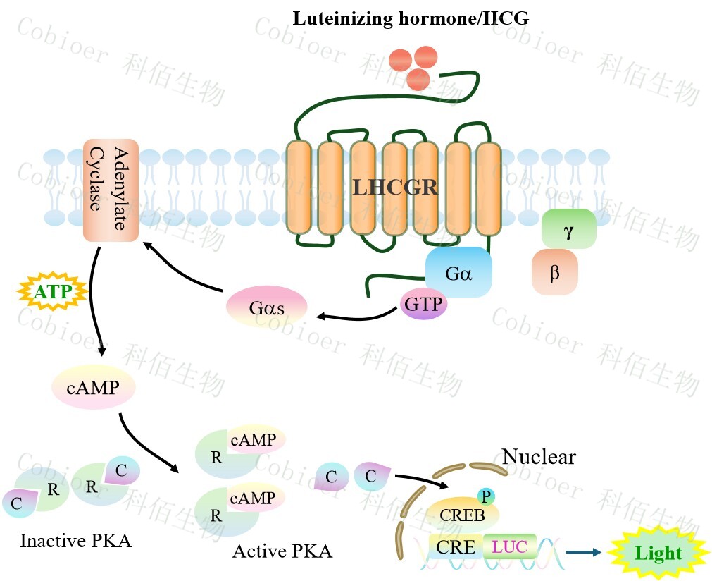 LHCGR CRE-Luc HEK293 報(bào)告基因藥靶模型很好的模擬了體內(nèi) LHCGR 的信號(hào)轉(zhuǎn)導(dǎo)過程,原理見下圖所示。![]() Figure 1. LHCGR CRE-Luc HEK293 細(xì)胞模型原理圖 |