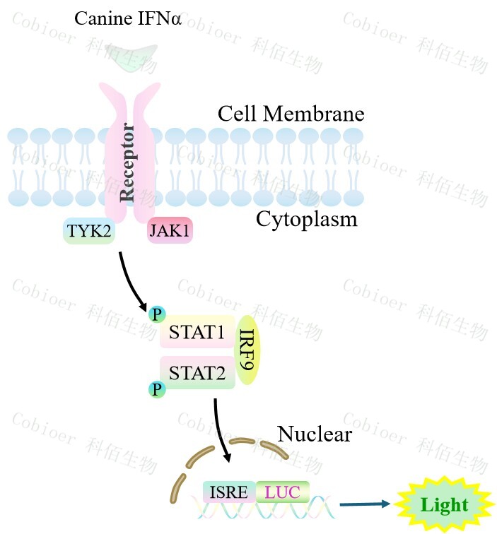 Canine IFNα&β Effector Reporter Cell 報告基因細胞,是由調控因子調控 并表達 Luc 熒光素酶報告基因的重組細胞。IFNα與受體結合,激活 ISRE 的原理見下圖所示。