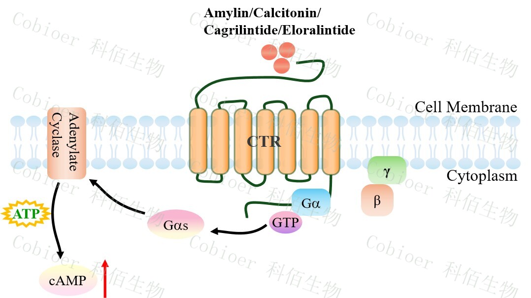 | 降鈣素基因相關肽(CGRP)家族包括 CGRP 本身、降鈣素(CT)、腎上腺髓質素 (AM)和胰島淀粉樣肽(AMY)。 胰淀素(Amylin)受體的三種類型的已被確定,即 AMY1,AMY2 和 AMY3。胰淀素 受體屬于 B 類 GPCR,是異二聚體復合物,由降鈣素受體(CTR)與受體活性修飾蛋白 (RAMPs)結合形成。該受體的 CTR 組分具有相同的 GPCR 結構:7 個跨膜相互連接的α- 螺旋,將細胞外信號傳遞到細胞內細胞質信號級聯(lián)。RAMP 有三種類型(RAMP1、 RAMP2 和 RAMP3),它們共享 31%的氨基酸序列,具有相似的基本結構。RAMP 是將 CTR 轉運到細胞膜并調節(jié)其配體特異性的重要肽,它可以改變特定 GPCR 的藥理學、功能 和細胞運輸。 哺乳動物細胞中 Amylin 受體的激活已被證明可以提高 cAMP,并被認為與 Gs 蛋白和 腺苷酸環(huán)化酶的刺激有關。在 RAMPs 的存在下,其與胰淀素的結合親和力可以被修飾。 CTR 和 RAMP1 或 CTR 和 RAMP3 的異質結構被認為有利于與胰淀素結合,介導大腦中的 生理功能。AMY3 的激活刺激 G 蛋白 Gαs,進一步控制腺苷酸環(huán)化酶(AC),隨后增加細 胞 cAMP。cAMP 與 PKA 調控亞基(R2)的結合誘導 PKA 四聚體全酶解離,導致 PKA 催 化亞基的激活。cAMP 激活的 PKA 參與調控 ERK1/2 的活性。ERK1/2 通路的觸發(fā)可能導致 Ca 2+分布不均勻,引發(fā)內質網和線粒體功能障礙,導致細胞死亡。此外,cAMP 刺激 AKT 進一步導致轉錄因子 cFos 的表達。 |