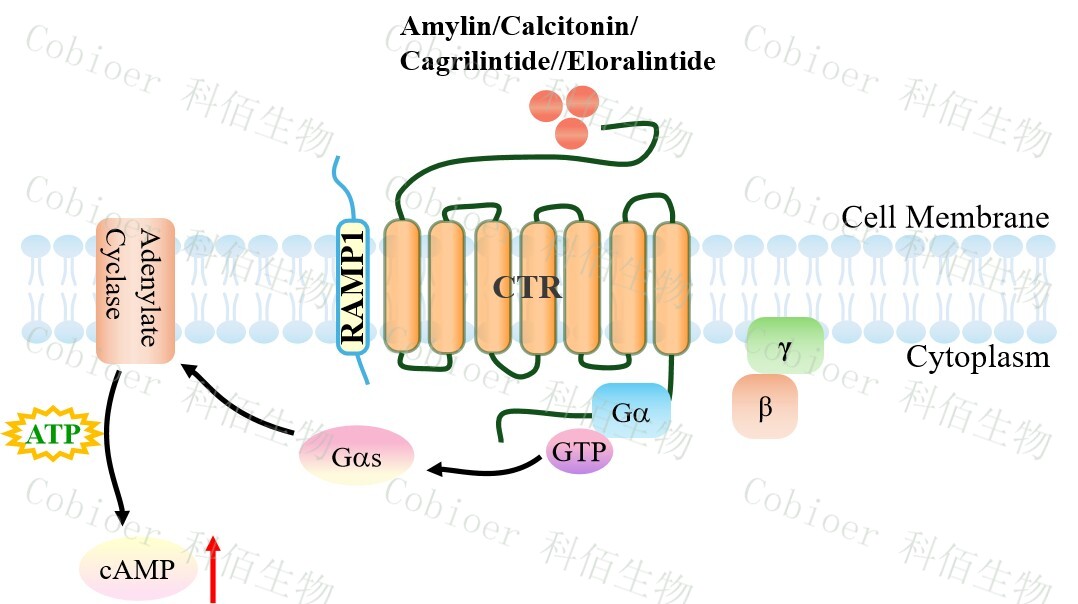 | 降鈣素基因相關肽(CGRP)家族包括 CGRP 本身、降鈣素(CT)、腎上腺髓質素 (AM)和胰島淀粉樣肽(AMY)。 胰淀素(Amylin)受體的三種類型的已被確定,即 AMY1,AMY2 和 AMY3。胰淀素 受體屬于 B 類 GPCR,是異二聚體復合物,由降鈣素受體(CTR)與受體活性修飾蛋白 (RAMPs)結合形成。該受體的 CTR 組分具有相同的 GPCR 結構:7 個跨膜相互連接的α- 螺旋,將細胞外信號傳遞到細胞內細胞質信號級聯(lián)。RAMP 有三種類型(RAMP1、 RAMP2 和 RAMP3),它們共享 31%的氨基酸序列,具有相似的基本結構。RAMP 是將 CTR 轉運到細胞膜并調節(jié)其配體特異性的重要肽,它可以改變特定 GPCR 的藥理學、功能 和細胞運輸。 哺乳動物細胞中 Amylin 受體的激活已被證明可以提高 cAMP,并被認為與 Gs 蛋白和 腺苷酸環(huán)化酶的刺激有關。在 RAMPs 的存在下,其與胰淀素的結合親和力可以被修飾。 CTR 和 RAMP1 或 CTR 和 RAMP3 的異質結構被認為有利于與胰淀素結合,介導大腦中的 生理功能。AMY3 的激活刺激 G 蛋白 Gαs,進一步控制腺苷酸環(huán)化酶(AC),隨后增加細 胞 cAMP。cAMP 與 PKA 調控亞基(R2)的結合誘導 PKA 四聚體全酶解離,導致 PKA 催 化亞基的激活。cAMP 激活的 PKA 參與調控 ERK1/2 的活性。ERK1/2 通路的觸發(fā)可能導致 Ca 2+分布不均勻,引發(fā)內質網(wǎng)和線粒體功能障礙,導致細胞死亡。此外,cAMP 刺激 AKT 進一步導致轉錄因子 cFos 的表達。 |