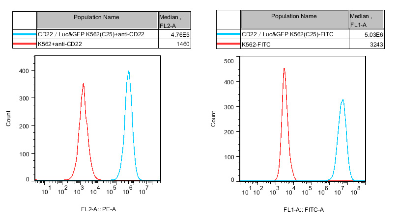 CD22/Luc&GFP K562 細(xì)胞,在 K562 細(xì)胞的基礎(chǔ)上,穩(wěn)定表達(dá)人 CD22。