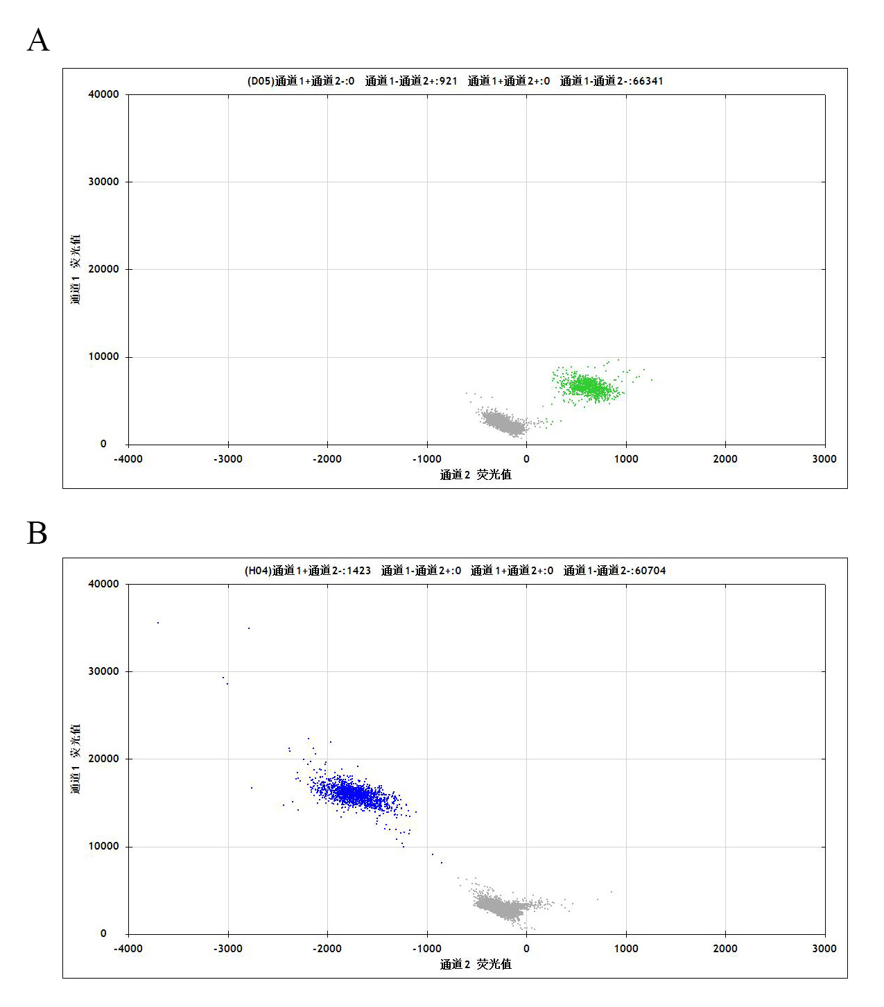 Figure 3. A:HCT116 Parental Cell;B:WRN[C727S](Homozygous,AF%:100) Isogenic HCT116 通道2 藍(lán)色微滴代表WRN[C727S]突變陽(yáng)性,通道2 綠色微滴代表該位點(diǎn)為陰性野生型