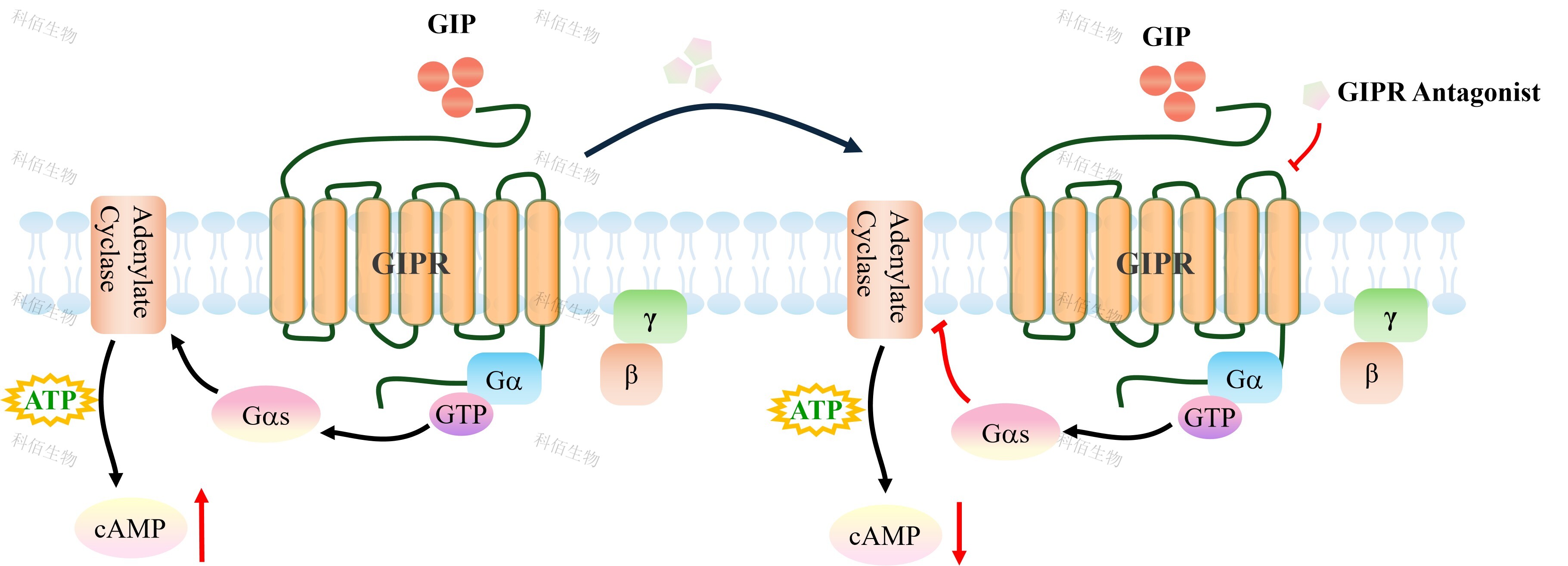 葡萄糖依賴性胰島素促泌多肽(又稱抑胃肽,GIP)、胰高血糖素樣肽-1(GLP-1)和 胰高血糖素(GCG)是負(fù)責(zé)葡萄糖穩(wěn)態(tài)的肽激素。它們的同源受體GIPR、GLP-1R和 GCGR屬于B1類GPCR家族。胃抑制多肽受體(GIPR)是GIP的受體,是一種具有7個(gè) 跨膜結(jié)構(gòu)域的G蛋白偶聯(lián)受體。它與GIP激素結(jié)合,以葡萄糖誘導(dǎo)的方式增強(qiáng)胰腺β細(xì)胞 胰島素的合成和分泌。胰腺β細(xì)胞上的GIPR在信號(hào)級(jí)聯(lián)中起著關(guān)鍵作用,導(dǎo)致血糖水平 升高時(shí)胰島素釋放。 |