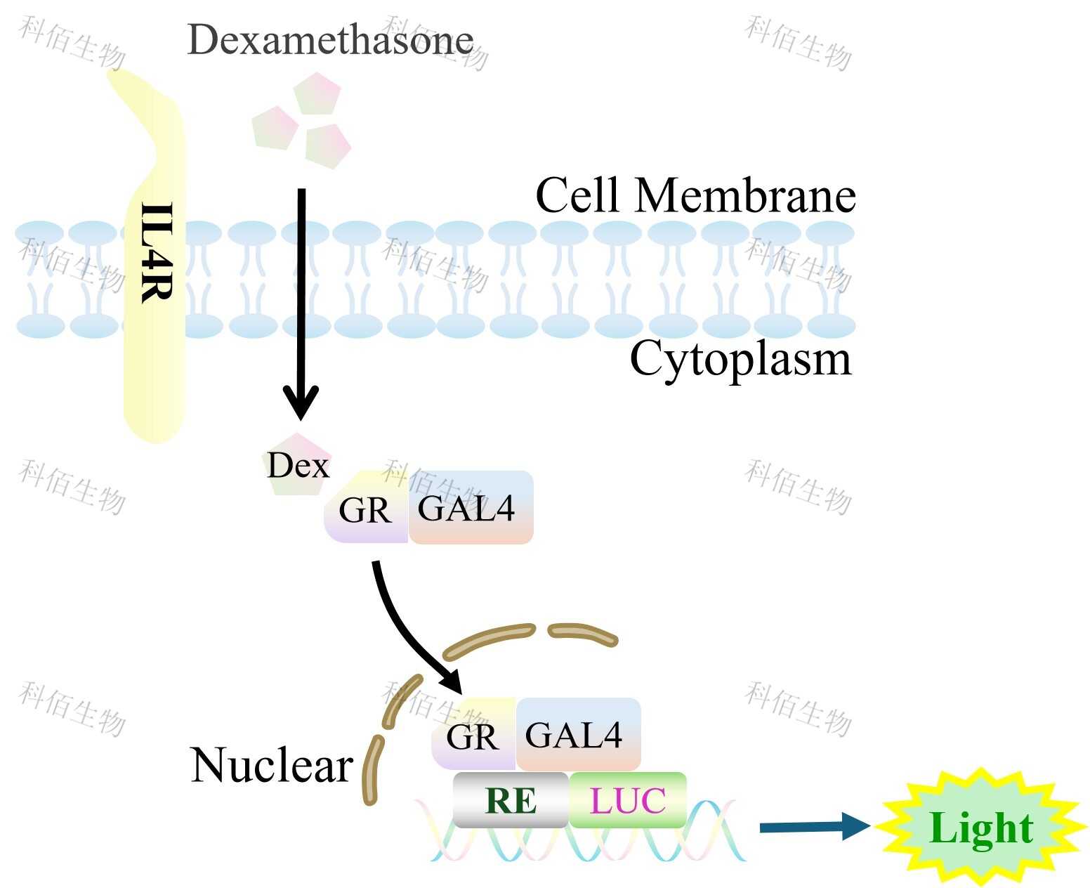 IL4R(High expression)&GR-GAL4 Luciferase Reporter HEK293 報(bào)告基因細(xì)胞,是在 GR-GAL4 Luciferase Reporter HEK293 重組細(xì)胞上過表達(dá)人的 IL4R。Dexamethasone (Hexadecadrol,地塞米松)是糖皮質(zhì)激素受體 (Glucocorticoid Receptor)激動(dòng)劑、凋亡誘導(dǎo)劑,原理見下圖所示。