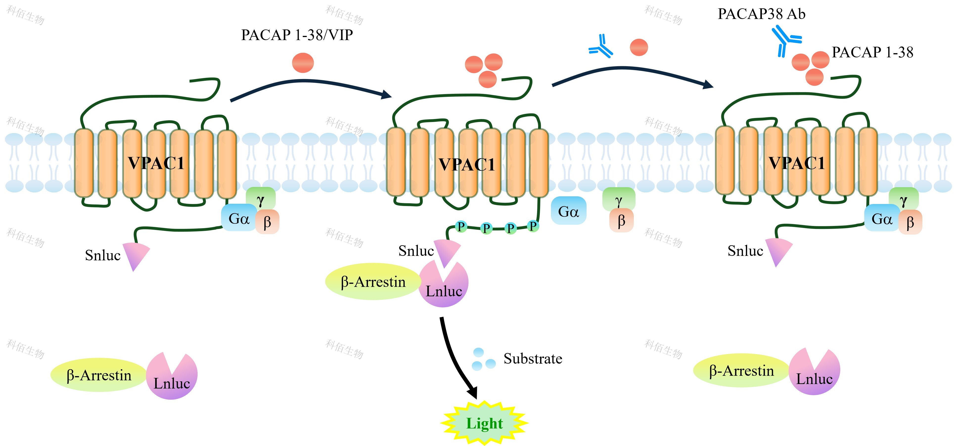 VPAC1 β-Arrestin CHO 報告基因藥靶模型很好的模擬了體內(nèi) VPAC1/β-Arrestin 的信號轉(zhuǎn)導過程,原理見下圖所示。當缺乏配體刺激時,β-Arrestin 不與 VPAC1 結(jié)合,融合β- Arrestin 的熒光素酶處于失活構(gòu)象,當 VPAC1 遭遇配體刺激時,融合熒光素酶報告基因的 β-Arrestin 被招募,使熒光素酶報告基因處于激活狀態(tài),加入其底物后發(fā)光信號增強。![]() Figure 1. VPAC1 β-Arrestin CHO 細胞模型原理圖 |