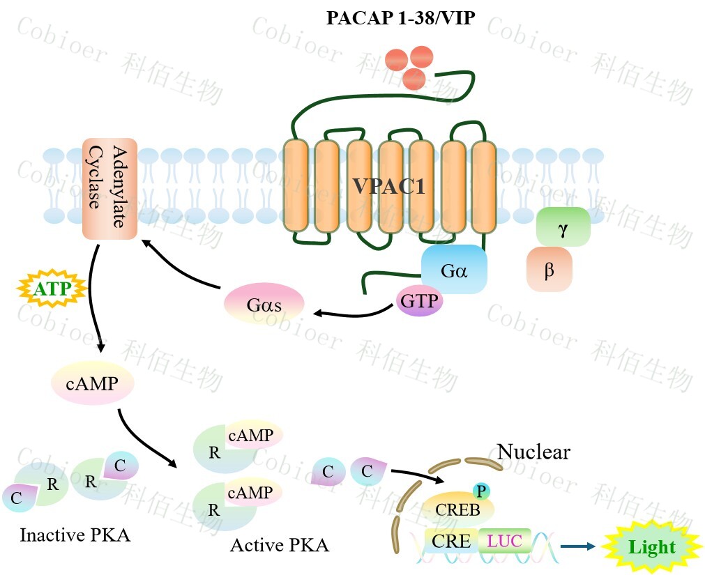 VPAC1 CRE-Luc HEK293 報告基因藥靶模型很好的模擬了體內(nèi) VPAC1 的信號轉(zhuǎn)導過程,原理見下圖所示。![]() Figure 1. VPAC1 CRE-Luc HEK293 細胞模型原理圖 |