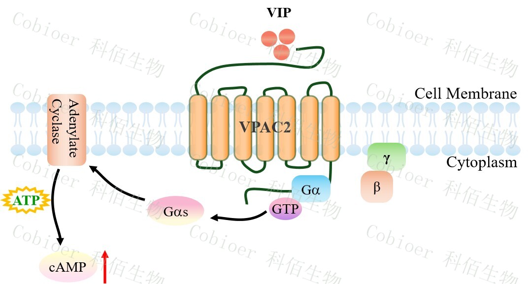 | PACAP/VIP 受體家族屬于 B 類 G 蛋白偶聯(lián)受體(GPCR),包含 PAC1R (PAC1)、 VPAC1R (VPAC1) 和 VPAC2R (VPAC2) 三個亞型,共同響應(yīng)神經(jīng)肽 PACAP(垂體腺苷酸 環(huán)化酶激活肽)和 VIP(血管活性腸肽)的調(diào)控,通過激活 Gs/cAMP-PKA 核心信號軸 (部分亞型偶聯(lián) Gq/PLC)廣泛協(xié)調(diào)神經(jīng)內(nèi)分泌、代謝穩(wěn)態(tài)與免疫調(diào)節(jié)。 VPAC2 受體(血管活性腸肽受體 2 型)作為 B 類 GPCR 的核心亞型,主要富集于下丘 腦視交叉上核(SCN)、胰腺β細(xì)胞、脂肪組織及骨細(xì)胞,以同等高親和力結(jié)合 VIP 和 PACAP,通過 Gs/cAMP-PKA 通路調(diào)控代謝穩(wěn)態(tài)與晝夜節(jié)律。VPAC2 的激活可同步 SCN 生物鐘基因(如 Per2)振蕩以維持睡眠-覺醒周期、促進(jìn)胰島素/胰高血糖素脈沖式分泌調(diào) 控血糖平衡、抑制破骨細(xì)胞分化并增強(qiáng)骨形成。 |