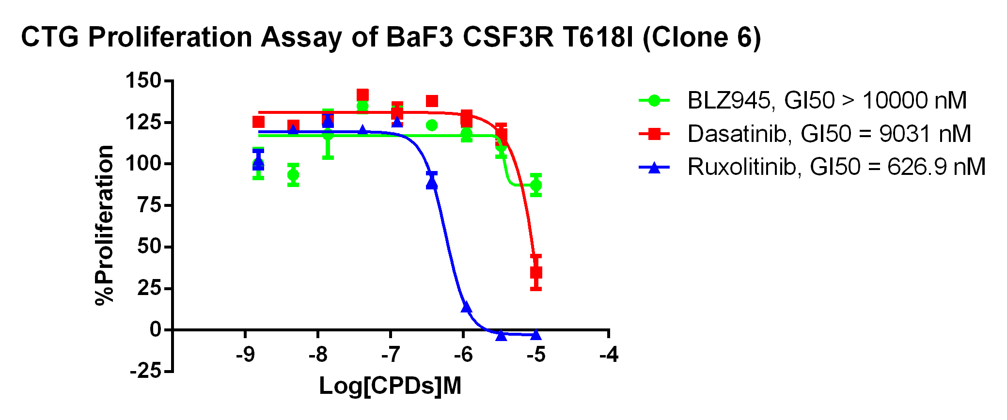 Figure 2. Anti-proliferation assay of three reference compounds on the CSF3R T618I/BaF3.