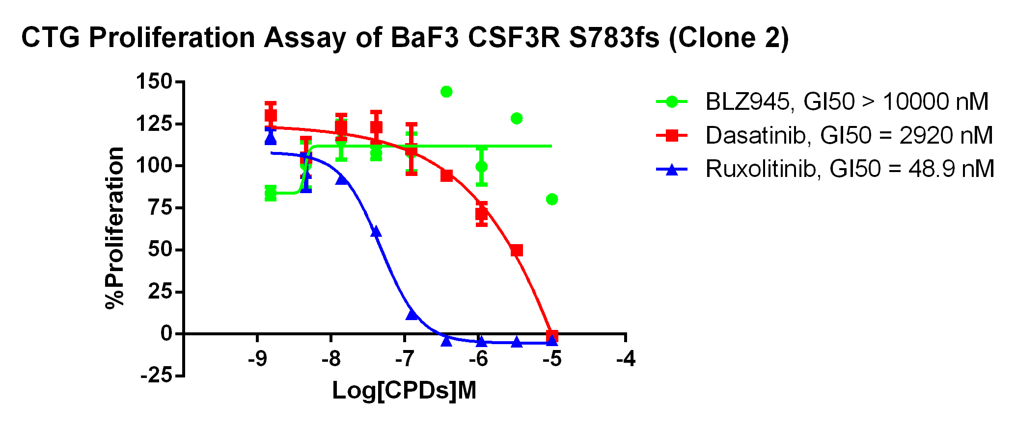 Figure 2. Anti-proliferation assay of three reference compounds on the CSF3R S783fs/BaF3.