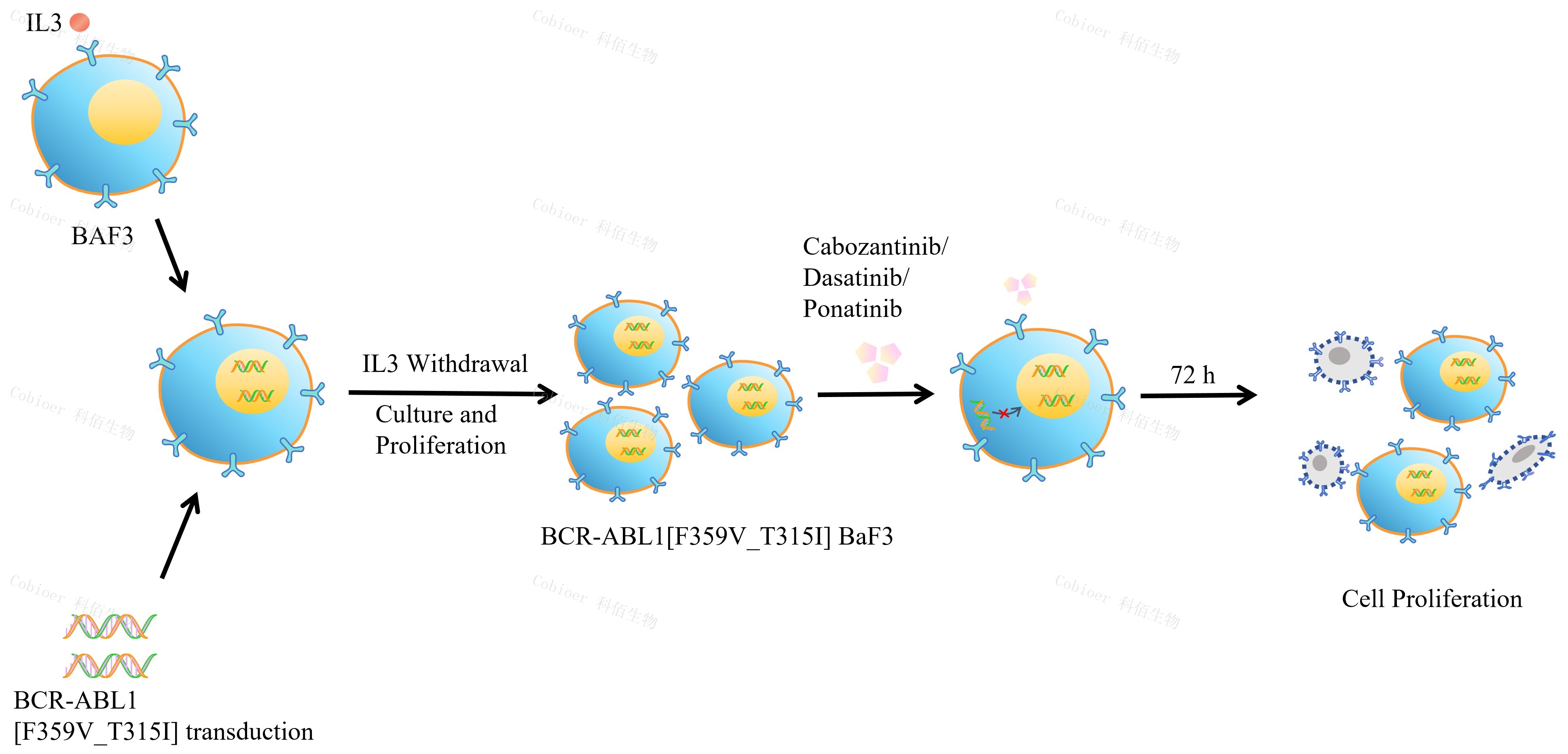 BCR-ABL1[F359V_T315I] BaF3 藥靶細(xì)胞,通過轉(zhuǎn)導(dǎo)突變狀態(tài)的 BCR- ABL1[F359V_T315I] 基因到 BaF3 細(xì)胞系中 , 穩(wěn)定表達(dá)人突變形態(tài)下的 BCR- ABL1[F359V_T315I]基因。