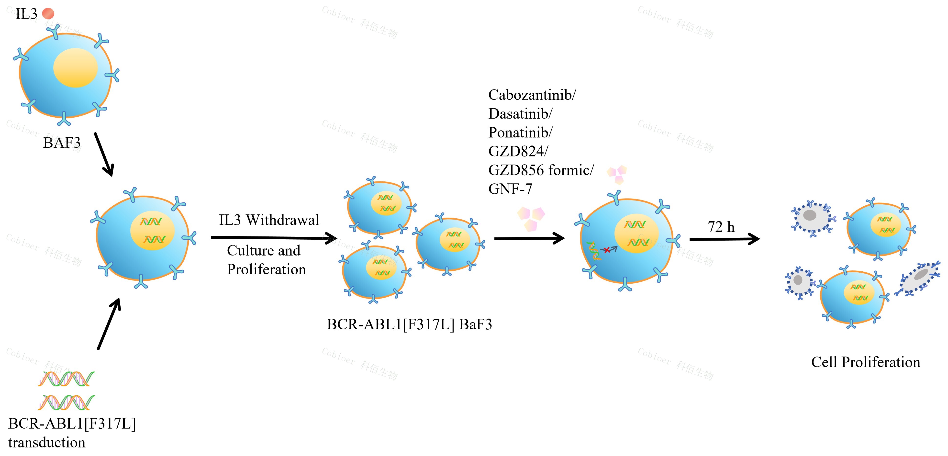BCR-ABL1[F317L] BaF3 藥靶細(xì)胞 , 通過轉(zhuǎn)導(dǎo)突變狀態(tài)的 BCR- ABL1[F317L]基因到 BaF3 細(xì)胞系中,穩(wěn)定表達人突變形態(tài)下的 BCR-ABL1[F317L]基因。