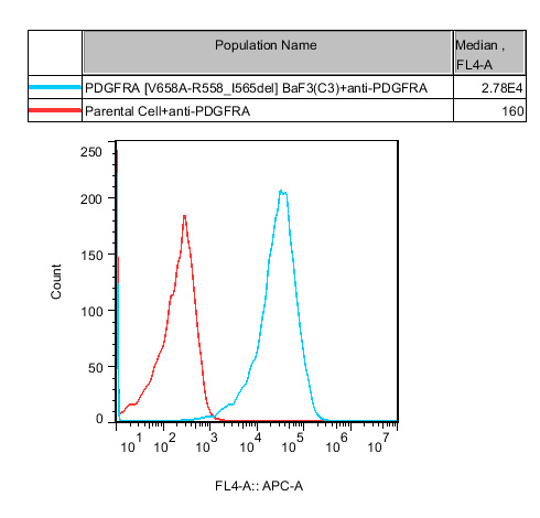 PDGFRA[V658A_R558_I565del] BaF3 藥靶細(xì)胞,通過轉(zhuǎn)導(dǎo)突變狀態(tài)的 PDGFRA[V658A_R558_I565del] 基因到 BaF3 細(xì)胞系中 ,穩(wěn)定表達(dá)人突變形態(tài)下的PDGFRA[V658A_R558_I565del] 基因。
