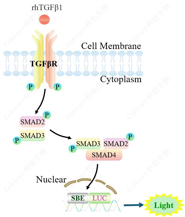SBE-Luc HEK293 報告基因細胞,是由 SBE 調(diào)控并表達 Luc 熒光素酶報 告基因的 HEK293 細胞。TGF-β與受體結合,激活 SBE 的原理見下圖所示。![]() Figure 1. SRE-Luc HEK293 細胞模型原理圖 |