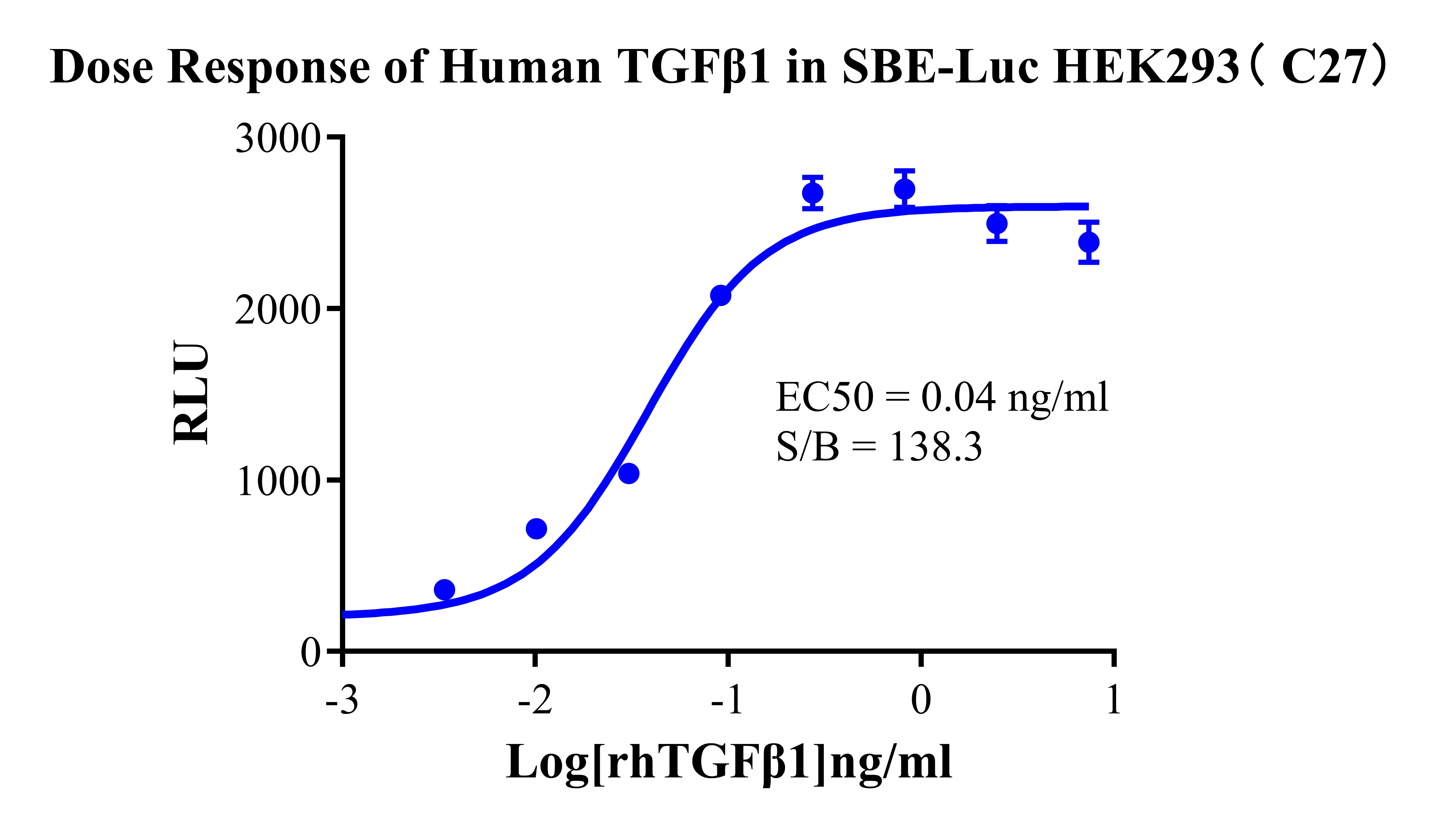 Figure 2. Detect Luciferase assay by Ultra Luciferase Detection Kit CBPH0001(we strongly suggest to purchase from Cobioer). Dose Response of Human TGFβ1 in SBE-Luc HEK293(C27).
