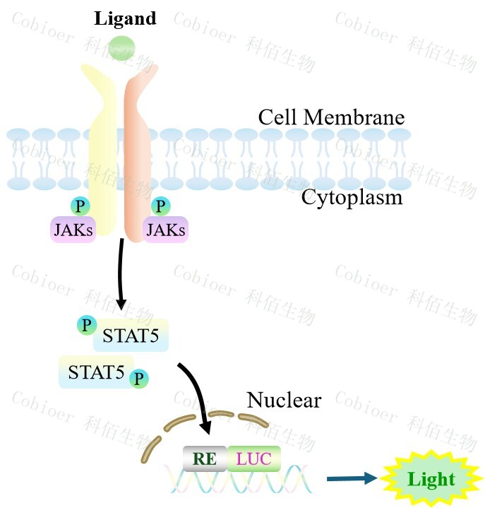 STAT5-Luc TF1 報(bào)告基因細(xì)胞,是由 STAT5 調(diào)控并表達(dá) Luc 熒光素酶報(bào) 告基因的 TF1 細(xì)胞。GM-CSF 與受體結(jié)合,激活 STAT5 的原理見下圖所示。![]() Figure 1. STAT5-Luc TF1 細(xì)胞模型原理圖 |