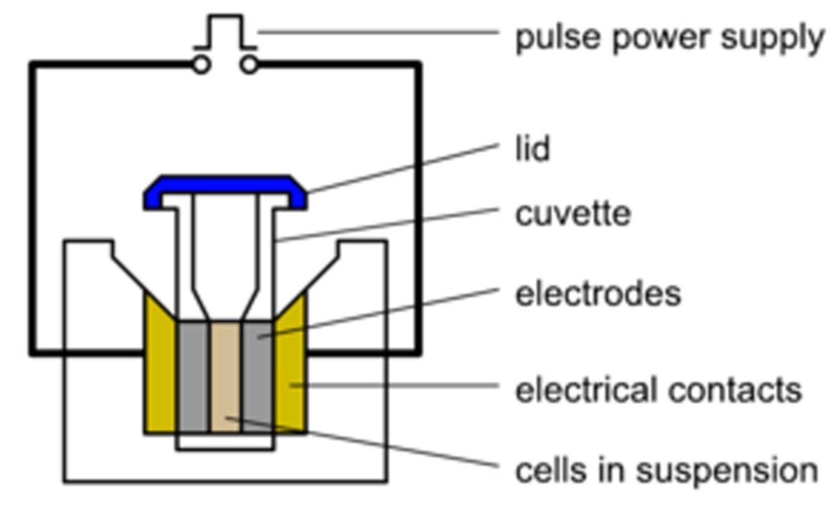 體外電穿孔時,將靶細(xì)胞懸浮液與待導(dǎo)入細(xì)胞的質(zhì)粒DNA在導(dǎo)電溶液中混合,然后放入比色皿中(圖1)。電穿孔比色皿的樣品室兩側(cè)各有一塊金屬板,電流可以通過混合物。將比色皿放入電穿孔儀的腔室中,該腔室配有相應(yīng)的電觸點,使比色皿形成電路。電穿孔儀上的控制器允許用戶設(shè)置待輸送電脈沖的電壓、波形和持續(xù)時間,這些參數(shù)應(yīng)根據(jù)靶細(xì)胞類型進(jìn)行優(yōu)化。然后,電脈沖通過樣品室。