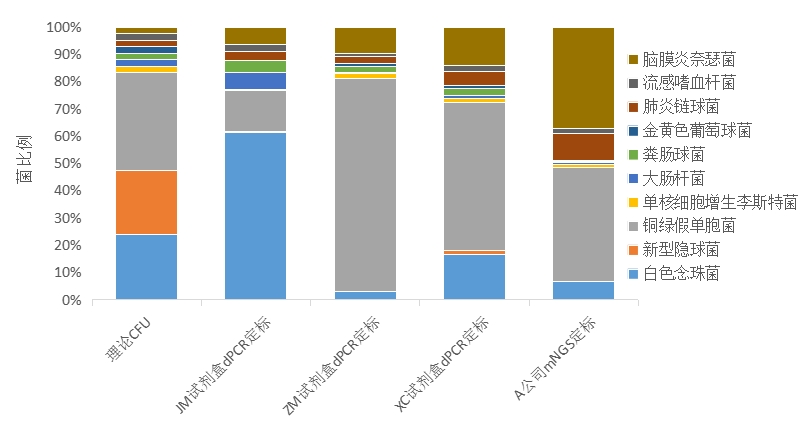 同時,我們也對此產(chǎn)品進行了mNGS的檢測,在無差別檢測比對得到的數(shù)據(jù)中,10個菌都可以檢出,但是比例與數(shù)字PCR也有同樣的差異。