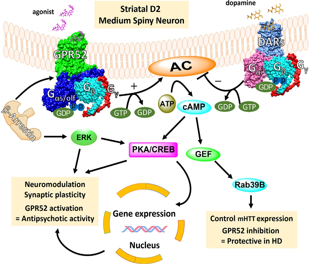 GPR52 是一種高度進(jìn)化保守、腦部富集的G 蛋白偶聯(lián)受體 (GPCR),其與非孤兒型GPCR的序列同源性低于20%。由于其內(nèi)源性配體未知且與非孤兒型GPCR的結(jié)構(gòu)相似度低,GPR52的生理功能尚未得到充分闡明。然而,GPR52在cAMP依賴(lài)性細(xì)胞反應(yīng)中的功能作用已逐漸明晰,有文獻(xiàn)揭露了GPR52的cAMP依賴(lài)性信號(hào)通路以及在伏隔核中等棘神經(jīng)元(MSNs)中與其他功能蛋白的相互作用。GPR52與Gs或Golf偶聯(lián),促進(jìn)腺苷酸環(huán)化酶(AC)活性,提高cAMP水平,進(jìn)而誘導(dǎo)蛋白激酶A(PKA)激活和cAMP反應(yīng)元件結(jié)合蛋白(CREB)的表達(dá),從而調(diào)節(jié)細(xì)胞反應(yīng)和基因表達(dá)。(此外,GPR52還能招募并相互作用于β-arrestins,這可能會(huì)導(dǎo)致細(xì)胞外信號(hào)調(diào)節(jié)激酶(ERK)磷酸化信號(hào)的激活。相比之下,被激活的多巴胺受體(DARs),如 D2/D3 受體(D2R/D3R),與 Gi/o 蛋白偶聯(lián),抑制腺苷酸環(huán)化酶(AC)的活性,從而導(dǎo)致環(huán)磷酸腺苷(cAMP)的生成減少。GPR52 和 D2R 分別在激活和減少 cAMP 信號(hào)傳導(dǎo)方面的作用相反,這支持了 GPR52 激動(dòng)劑能夠阻止 D2R 信號(hào)傳導(dǎo)的概念,從而在神經(jīng)精神疾病中產(chǎn)生類(lèi)似抗精神病藥物的效果。