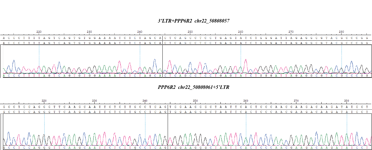五步正交驗(yàn)證(NGS(整合關(guān)聯(lián)擴(kuò)增技術(shù)(IAA,靶向捕獲, LAM-PCR)+ Sanger確認(rèn) + dPCR定量),確保位點(diǎn)序列與頻率的準(zhǔn)確性。在驗(yàn)證LTR整合基因組位點(diǎn)的基礎(chǔ)上,進(jìn)一步驗(yàn)證了載體上其他基因序列在基因組上的非典型整合位點(diǎn)。