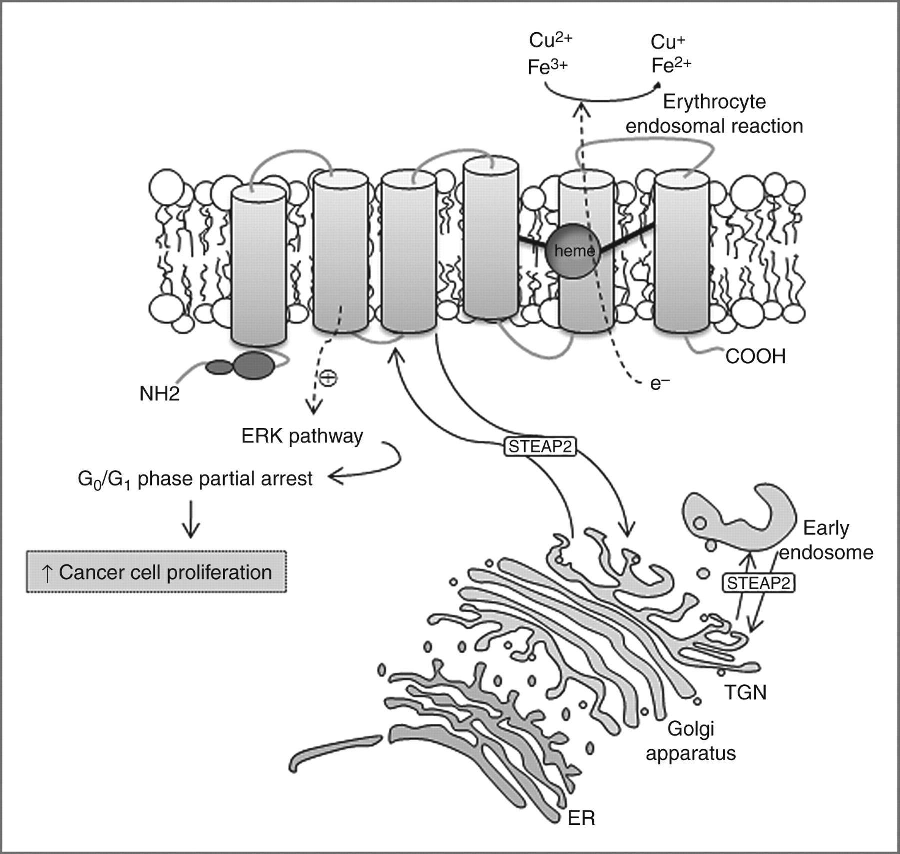 STEAP2,又被稱為前列腺六跨膜蛋白 1(STAMP1),是一種由 490 個氨基酸組成的(56.1 kDa)蛋白質,其在高爾基體復合體、跨高爾基體網絡以及質膜中高度表達。這表明 STEAP2 參與了某些內吞和外排運輸途徑。STEAP2 有助于紅細胞中 Fe3+ 和 Cu2+ 的正常攝取,并將其還原為 Fe2+ 和 Cu+,從而促進轉鐵蛋白循環(huán)的進行。通過激活 ERK 通路,STEAP2 誘導癌細胞在 G0-G1 細胞周期階段的部分停滯,從而增加細胞增殖和腫瘤發(fā)展。