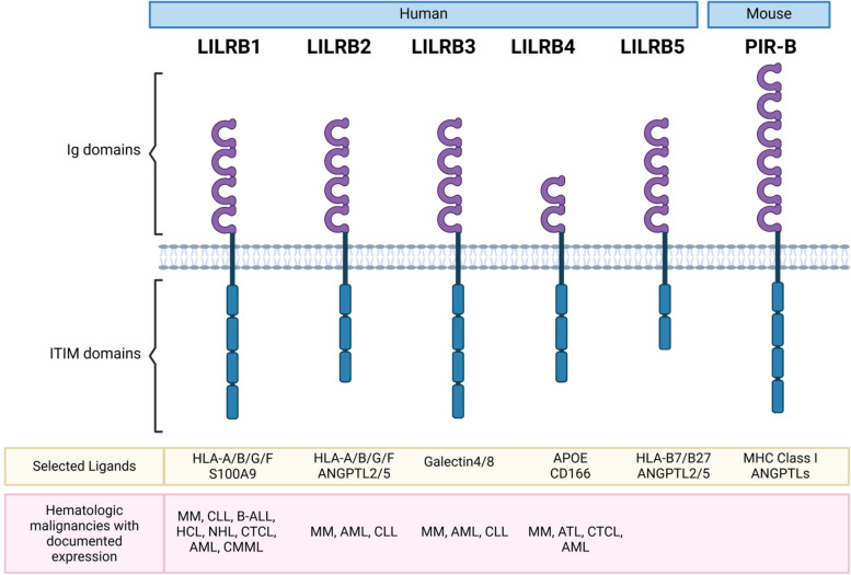 白細(xì)胞免疫球蛋白樣受體亞家族B(LILRB)因在腫瘤微環(huán)境中起到免疫抑制作用,逐漸受到越來越多的關(guān)注。其家族包含5個(gè)成員:LILRB1(LIR-1, ILT2, CD85j)、LILRB2(LIR-2, ILT4, CD85d)、LILRB3(LIR-3, ILT5, CD85a)、LILRB4(LIR-5, ILT3, CD85k)、LILRB5(LIR-8, CD85c)。LILRB家族結(jié)構(gòu)及配體如下圖所示: