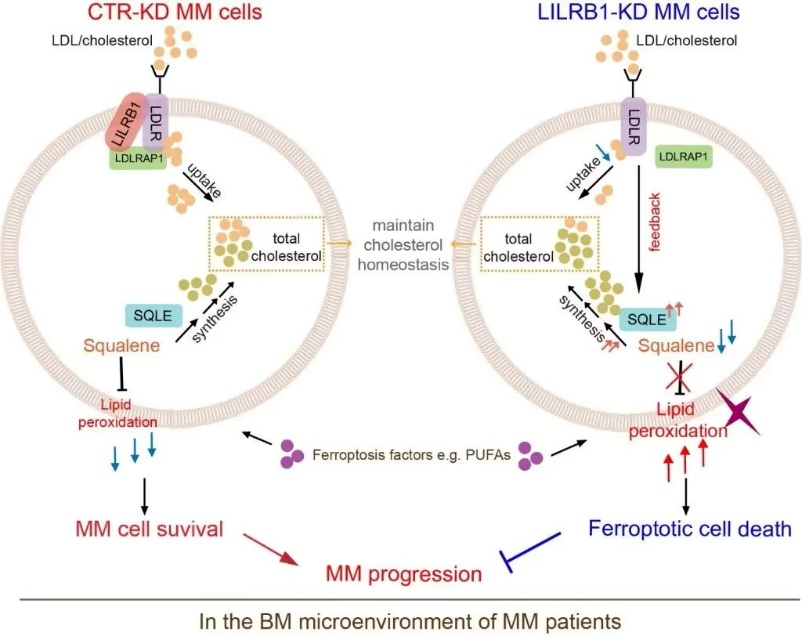 另有文獻(xiàn)揭示在多發(fā)性骨髓瘤(MM:multiple myeloma)細(xì)胞中,膜蛋白LILRB1通過協(xié)助MM細(xì)胞攝取低密度脂蛋白(LDL),維持細(xì)胞內(nèi)膽固醇合成通路中具有抗氧化作用的代謝物角鯊烯(squalene)的含量,從而保護(hù)MM細(xì)胞不發(fā)生鐵死亡,促進(jìn)多發(fā)性骨髓瘤的惡性進(jìn)展。