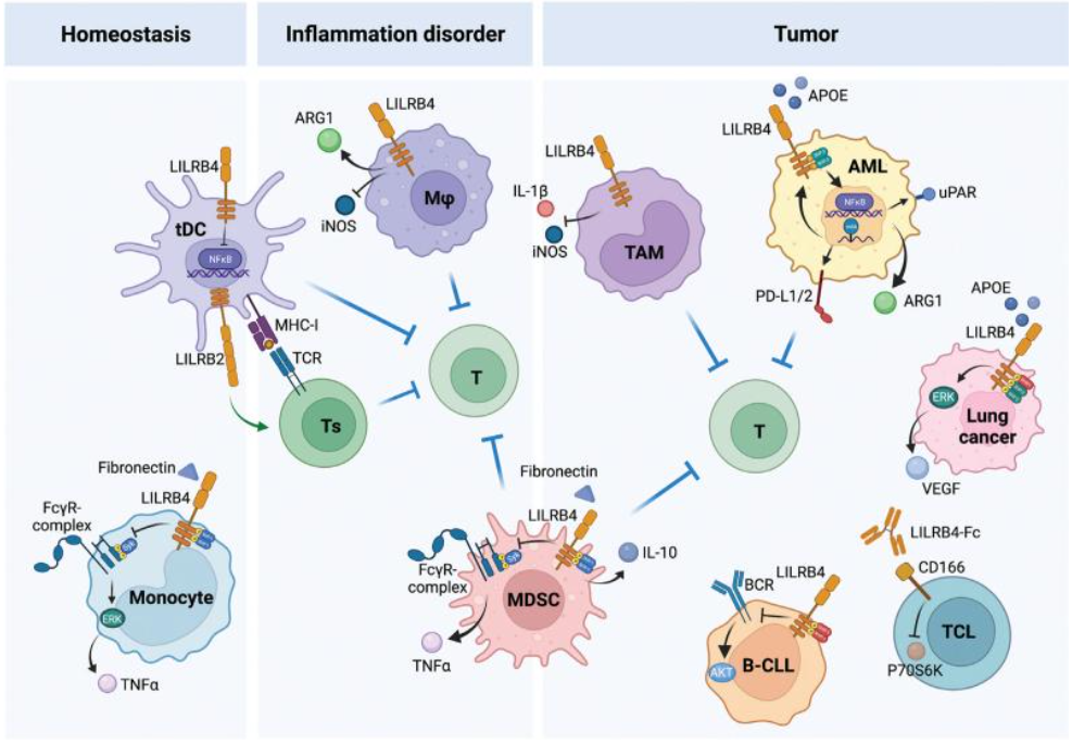 LILRB4可通過NF-kB信號傳導(dǎo)導(dǎo)致細(xì)胞凋亡,并通過降低磷酸酶(SHP)1磷酸化激活NF-kB信號傳導(dǎo)導(dǎo)致炎癥。LILRB4在多種腫瘤細(xì)胞中表達(dá),包括實(shí)體瘤和血液腫瘤。LILRB4還是單核細(xì)胞白血病的重要標(biāo)志物,通過ApoE/LILRB4/SHP-2信號軸在急性髓系白血病(AML)細(xì)胞中支持腫瘤細(xì)胞浸潤到組織中并抑制T細(xì)胞活性。因此,LILRB4是治療單核細(xì)胞急性髓細(xì)胞白血病的重要靶點(diǎn)。在肺癌細(xì)胞中,LILRB4被APOE結(jié)合激活,并募集SHP-2和SHIP-1激活ERK1/2信號傳導(dǎo)并增加血管內(nèi)皮生長因子(VEGF)的表達(dá)以促進(jìn)癌癥轉(zhuǎn)移。