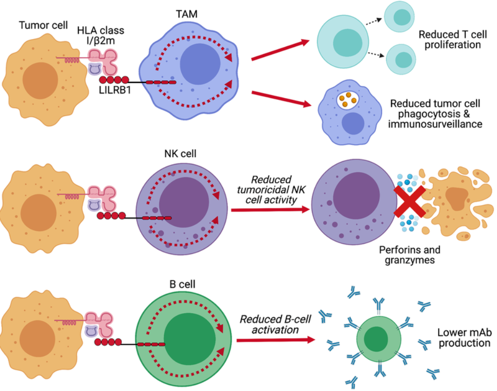 在LILRB家族中,LILRB1的細(xì)胞分布最為廣泛,包括原代NK細(xì)胞、B 細(xì)胞、各種T細(xì)胞群、單核細(xì)胞/巨噬細(xì)胞、嗜酸性細(xì)胞和嗜堿性細(xì)胞、樹突狀細(xì)胞、蛻膜巨噬細(xì)胞和破骨細(xì)胞。LILRB1介導(dǎo)的抑制可導(dǎo)致T細(xì)胞和NK細(xì)胞的增殖障礙,并產(chǎn)生“別吃我”信號,從而阻止巨噬細(xì)胞吞噬腫瘤。ILRB1也在某些AML細(xì)胞上表達(dá)來保護(hù)這些淋巴腫瘤細(xì)胞不被凋亡。在人類胃癌細(xì)胞中LILRB1高表達(dá)并可能促進(jìn)腫瘤的生長。