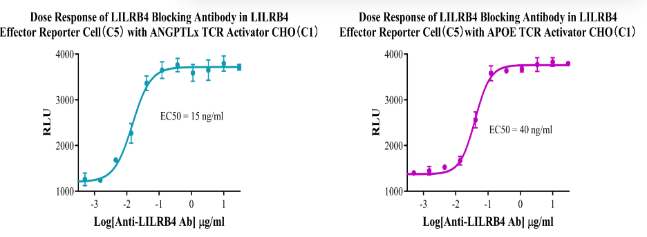 Figure 10. Dose response of LILRB4 Blocking antibody in LILRB4 Effector Reporter Cell(C5) With  ANGPTLx TCR Activitor CHO(C1)  and  APOE TCR Activitor CHO(C1).