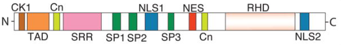 在人類中,NFAT家族由五個不同的基因產(chǎn)物組成,命名如下:NFAT1(也稱為NFATc2和NFATp);NFAT2(也稱為NFATc1和NFATc);NFAT3(也稱為NFATc4)NFAT4(也稱為NFATc3和NFATx)和NFAT5(也稱為TonEBP和OREBP)。鈣調(diào)控的經(jīng)典NFAT蛋白(NFAT 1-4)由多個功能模塊組成,這些模塊決定了蛋白質(zhì)的磷酸化、核內(nèi)定位、DNA結(jié)合以及目標(biāo)基因的轉(zhuǎn)活化。N端區(qū)域包含調(diào)控結(jié)構(gòu)域,包括酪蛋白激酶1(CK1)對接位點、轉(zhuǎn)活化結(jié)構(gòu)域(TAD)和鈣煜氨酸(Cn)對接位點。C端包含DNA結(jié)合的Rel同源結(jié)構(gòu)域(RHD)和一個額外的鈣化神經(jīng)素對接位點。蛋白質(zhì)中間有幾個富含絲氨酸的結(jié)構(gòu)域(SRR、SP1-3),為靶向NFAT的激酶提供磷酸化位點。此外,NFAT蛋白包含兩個調(diào)控其亞細(xì)胞定位的信號序列:核定位信號序列(NLS1和NLS2)和核輸出信號(NES)。與經(jīng)典的NFATc蛋白不同,NFAT5(也稱為強(qiáng)張增強(qiáng)蛋白結(jié)合蛋白)不依賴鈣神經(jīng)素或核伴侶即可發(fā)揮活性。