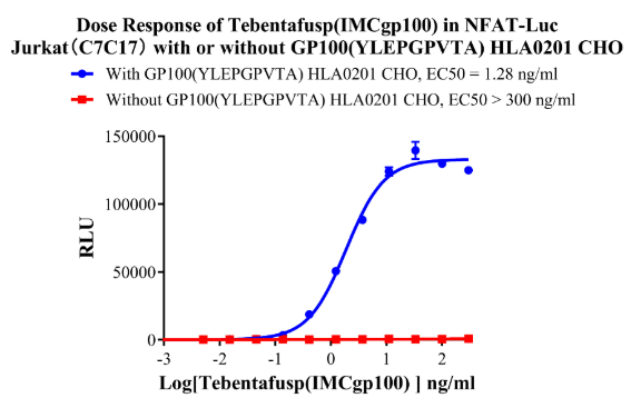 Figure 4.Dose Response of Tebentafusp (IMCgp100) in NFAT-Luc Jurkat(C7C17) with or without GP100(YLEPGPVTA) HLA0201 CHO.
