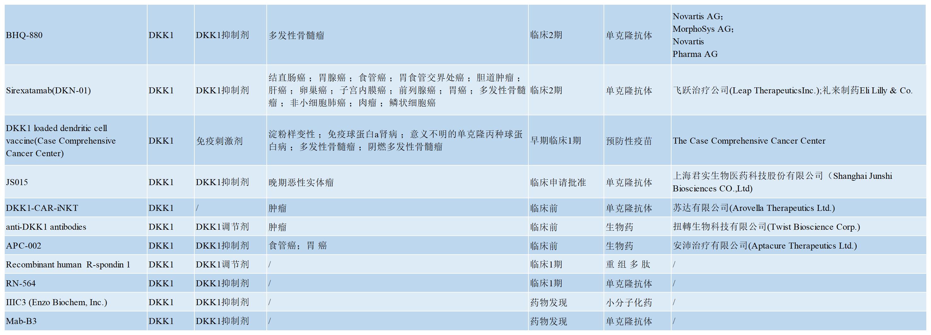 DKK1具有調(diào)節(jié)免疫的特性,它對免疫系統(tǒng)的抑制作用使其成為免疫治療的一個有前景的靶點。此前,Leap Therapeutics開發(fā)了抗DKK1中和抗體DKN-01并在晚期胃食管交界處和胃癌癥(GEJ/GC)以及婦科癌癥的I期或II期試驗中進行了評估,其方案包括與紫杉醇或pembrolizumab的單藥治療和聯(lián)合治療比較,值得注意的是,患有Wnt信號突變的婦科癌癥患者可以從DKN-01治療中獲益。GEJ/GC的另一項正在進行的臨床研究也表明,在腫瘤表達高水平DKK1(DKK1高)的患者中生存率和客觀反應(yīng)結(jié)果都有所提高;非常令人鼓舞的結(jié)果表明,DKN-01加Keytruda治療可使中位無進展生存期(PFS)超過22周,中位總生存期(OS)接近32周,在既往未接受抗PD-1/PD-L1治療的DKK1高GEJ/GC患者中,ORR為50%,疾病控制率(DCR)為80%;在對PD-1/PD-L1治療難治的6名GEJ/GC患者中,3名血清DKK1水平高的患者病情穩(wěn)定,而3名血清DKK1水平低的患者病情則發(fā)生進展。這些結(jié)果表明,DKK1抑制治療顯著改善了血清DKK1水平高的患者的療效,并由此得出在DKK1高表達腫瘤患者中使用DKK1抑制劑和PD1/PDL-1免疫檢查點聯(lián)合治療的方案是一種獲得更好療效的策略。目前已有多個DKK1抑制劑處于研發(fā)階段,其中多數(shù)為DKK1的中和抗體,也有少量的小分子及重組多肽,小核酸藥物等( 如下表所示)。