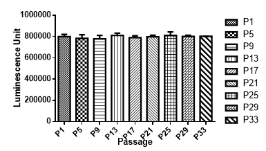 Figure 4. Stablity test results. Glioma261-Luc cells showed at least 32 passage stability with similar luminescence unit.