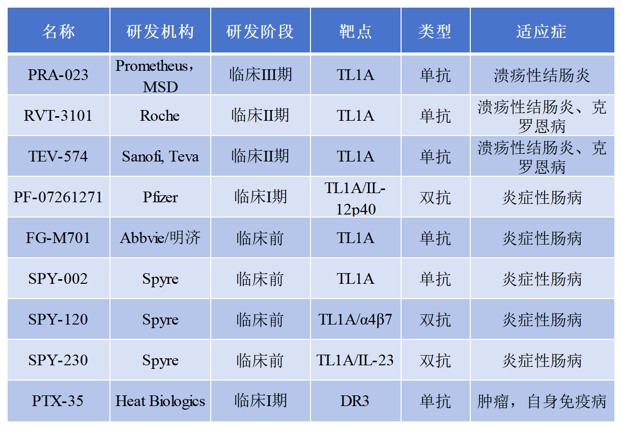 2023年10月23日,羅氏宣布收購Telavant,獲得其在研核心產(chǎn)品TL1A抗體RVT-3101,因此越來越多的藥企布局TL1A/DR3藥物的研發(fā)。目前關(guān)于TL1A靶點,在研藥物有單抗也有雙抗,主要針對克羅恩病、潰瘍性結(jié)腸炎等IBD疾病。關(guān)于DR3靶點,目前就只有PTX-35在研。