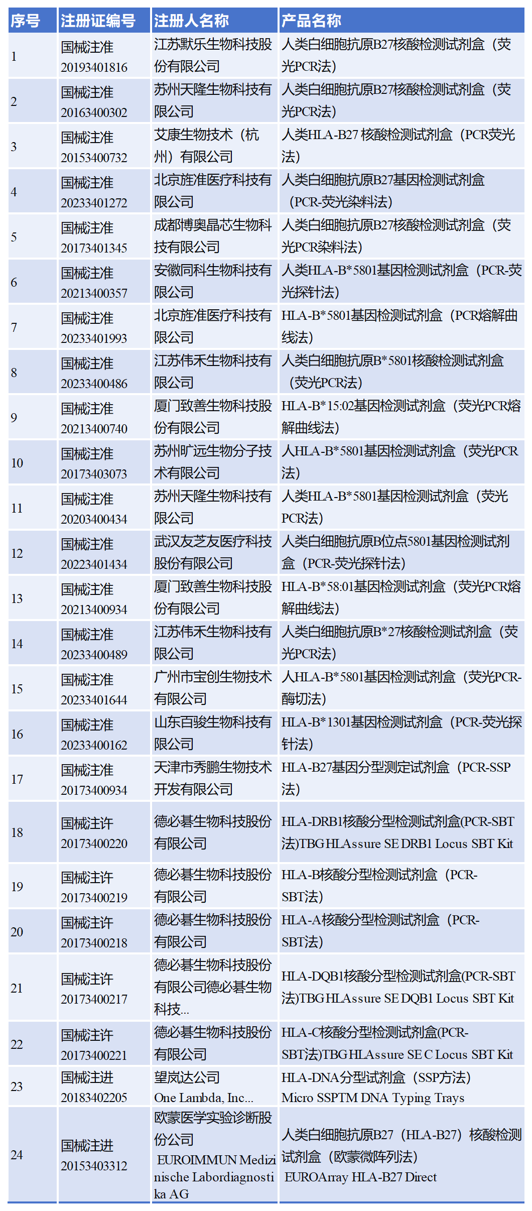 截至目前,已有24款HLA核酸檢測相關(guān)試劑盒獲批,具體如下: